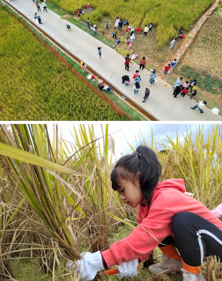 11月12日,市政集團建設(shè)的龍州濕地水稻田迎來了豐收季,藍天白云倒影在清澈見底的湖面,伴隨著五彩繽紛的波斯菊花海搖曳生姿,金黃色的稻谷在秋風(fēng)中散發(fā)著陣陣稻香...城市的繁華與美不勝收的風(fēng)景和諧共生的畫面,吸引了來自龍巖中心城區(qū)中小學(xué)生、家長及眾多市民前來參觀、體驗。學(xué)生們利用假期走進田間課堂,真切體會了龍巖“新晉網(wǎng)紅打卡地”的獨特魅力。
