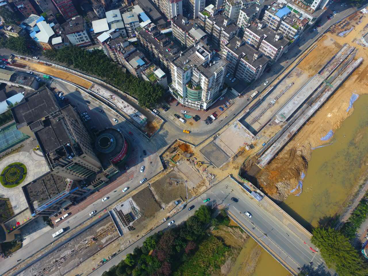 郵政交通節(jié)點項目起于蓮莊北路順康汽車檢測中心處,終于瑞德酒店門口,采取“主線下穿、左轉高架”方案,設下穿通道下穿南環(huán)西路與南環(huán)中路交叉口,全長700米,凈寬2×8.5米,其中暗埋段長度為120米,敞開段(U型槽)長275米;南環(huán)路往溪南南路方向設左轉匝道高架,橋長246米,兩側引道擋墻全長117米,項目總投資約1.4億元。