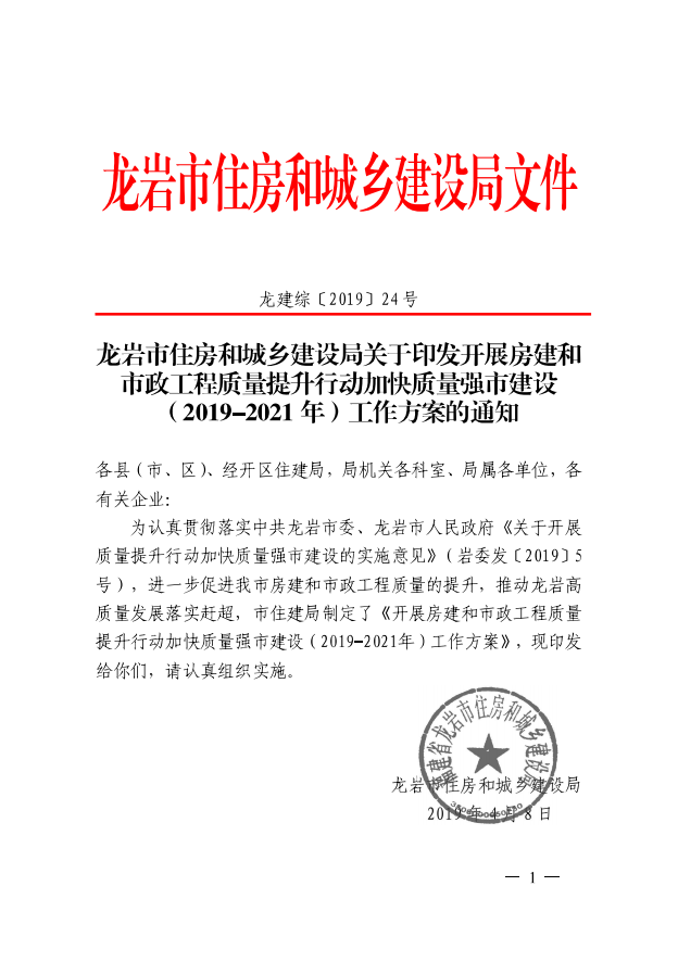 龍巖市住房和城鄉(xiāng)建設(shè)局關(guān)于印發(fā)開展房建和市政工程質(zhì)量提升行動加快質(zhì)量強(qiáng)市建設(shè)(2019-2021年)工作方案的通知